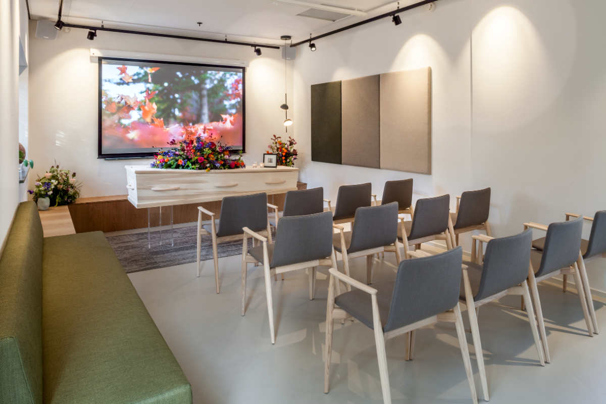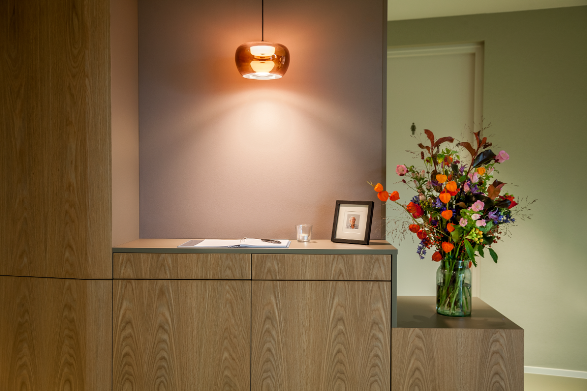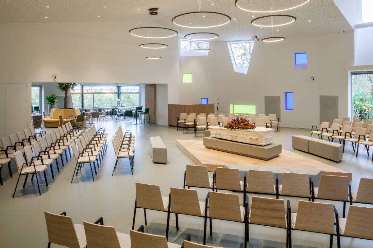 Een prachtige afscheidslocatie in een bosrijke omgeving. Aerdehof laat je kennis maken met alle mogelijke manieren van afscheid nemen. Naast de laatste verzorging en afscheid nemen in een van de rouwkamers of 24-uurs kamers, is het ook de mogelijk om hier afscheidsdiensten te houden. Alle onderdelen van afscheid nemen komen hier samen onder één dak. Spacefitters droeg verantwoordelijk voor het totaalproject van deze bijzondere plek: van concept tot oplevering, van materialisering tot verlichting en van maatwerk tot los meubilair.