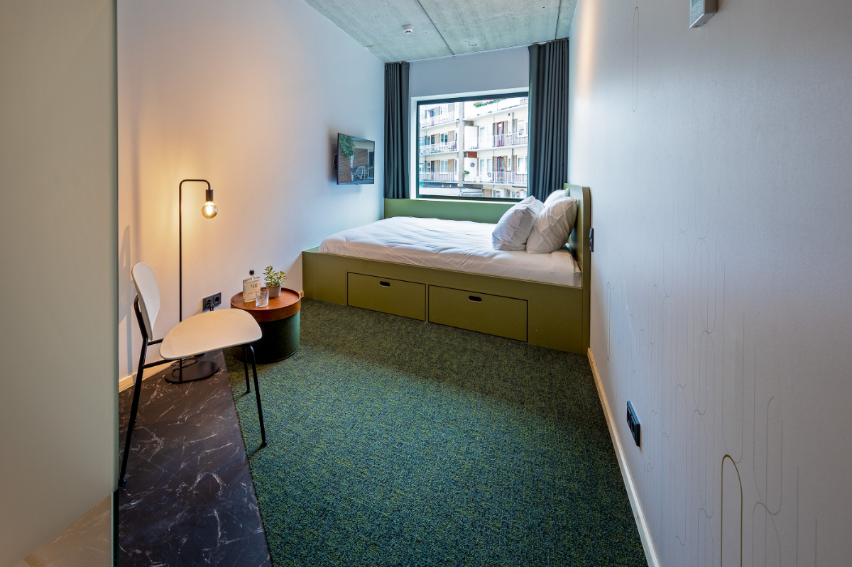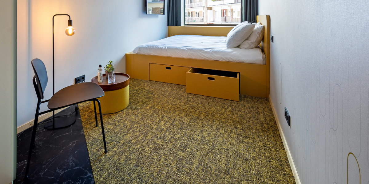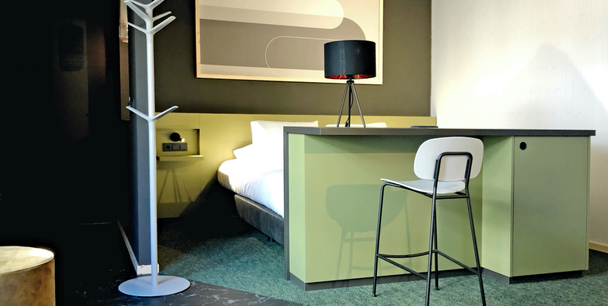 “Twee jaar geleden is Spacefitters gevraagd om het volledige interieur van het nieuw te bouwen hotel op zich te nemen. Van eerste schets tot definitief plan, van projectbegeleiding tot het plaatsen van het losse en vaste meubilair. Alles hebben we zorgvuldig uitgezocht en tot in detail uitgewerkt voor de leveranciers en interieurbouwers. Door alles in eigen hand te houden is er een prachtig hotel neergezet. Het interieur kenmerkt zich door zijn gewaagd kleurgebruik en grafisch lijnenspel.”